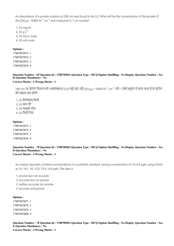 Step 4: Convert molarity to micromolar: \[ 2 \times 10^{-5}\,M = 20\,\muM \] Quick Tip: At \(280\,nm\), protein absorbance mainly arises from aromatic amino acids (tryptophan and tyrosine). For a \(1\,cm\) cuvette, concentration is simply \(c = A/\varepsilon\).