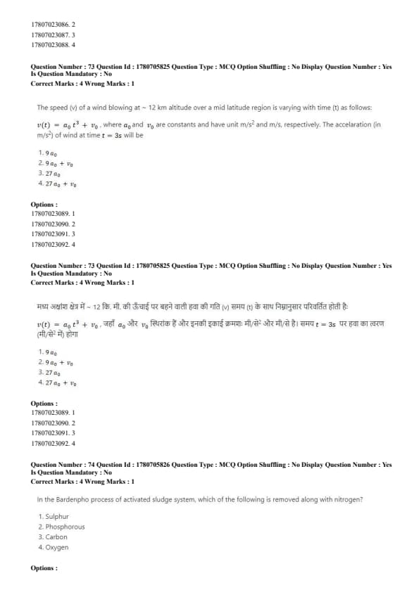 where \(a_0\) and \(v_0\) are constants and have units \(m s^{-4}\) and \(m s^{-1}\), respectively. The acceleration (in \(m s^{-2}\)) of wind at time \(t = 3\,s\) will be:
