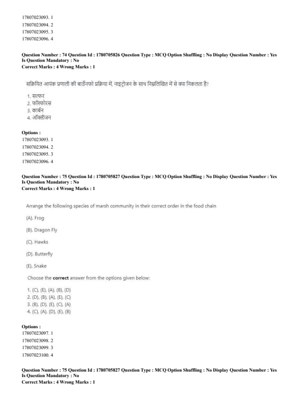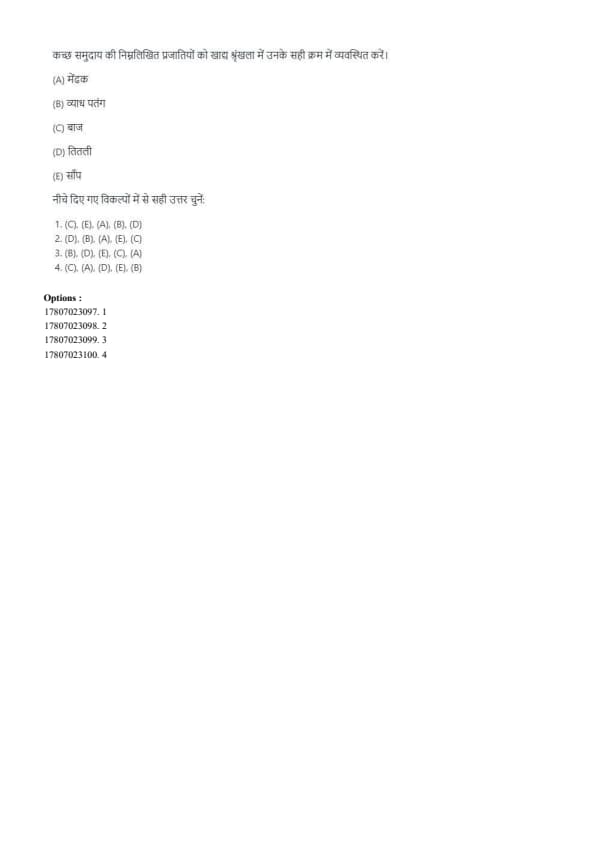 Step 6: Therefore, the correct food chain sequence is: \[ Butterfly \rightarrow Dragon fly \rightarrow Frog \rightarrow Snake \rightarrow Hawks \] Quick Tip: In food chains, energy flows from lower trophic levels (herbivores) to higher trophic levels (top carnivores).