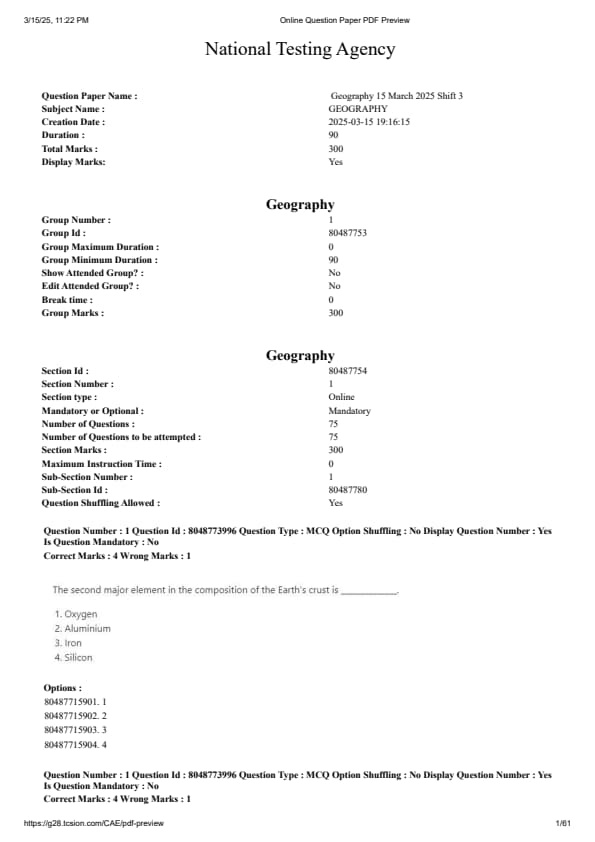 CUET PG Geography Question Paper 2025 is available here for download. NTA is conducting CUET PG 2025 Geography on 15 March 2025 in shift 3 from 4.00 PM - 05.30 PM. As per the revised exam pattern, candidates get 90 minutes to solve 75 MCQs in the CUET PG 2025 Geography question paper. The CUET PG 2025 Geography exam is expected to be of moderate to high difficulty, based on past trends and syllabus coverage.
