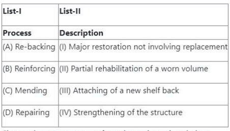 The correct matching is A-III, B-IV, C-I, D-II. Quick Tip: Focus on the key actions: "Re-backing" involves the back of the book. "Reinforcing" means to strengthen. "Mending" is fixing small tears. "Repairing" is a general term for fixing a worn book.