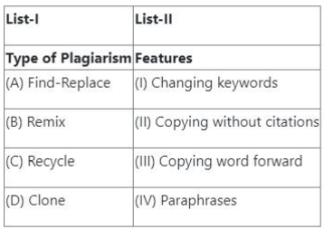 The correct matching is A-I, B-IV, C-II, D-III. Quick Tip: Associate the names with the actions: "Clone" is an exact copy. "Find-Replace" is about changing words. "Remix" is mixing different pieces together. "Recycle" is reusing old material.