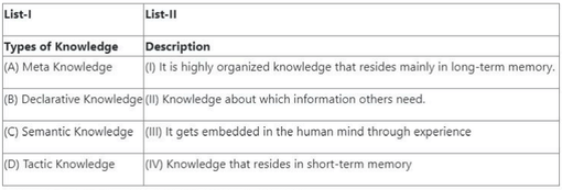The correct matching is A-II, B-IV, C-I, D-III. Quick Tip: Use simple associations: \(\textbf{Tacit}\) = experience. \(\textbf{Declarative}\) = facts you can state. \(\textbf{Semantic}\) = long-term concepts. \(\textbf{Meta}\) = knowledge about knowledge.