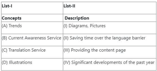 The correct matching is A-IV, B-III, C-II, D-I. Quick Tip: Match the core function: "Translation" is about language. "Illustrations" are pictures. "Current Awareness" is about what's new (like a content page). "Trends" are about recent developments.
