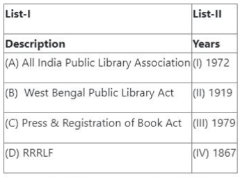 The correct matching is A-II, B-III, C-IV, D-I. Quick Tip: Remembering key dates is crucial. The Press Act is one of the oldest (1867). RRRLF was established in the early 70s (1972) to promote public libraries.