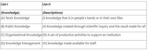 The correct matching is A-I, B-II, C-IV, D-III. Quick Tip: \(\textbf{Tacit}\) is personal. \(\textbf{Public}\) is for everyone. \(\textbf{Organizational}\) is for the staff. \(\textbf{Knowledge Management}\) is the process/activity.