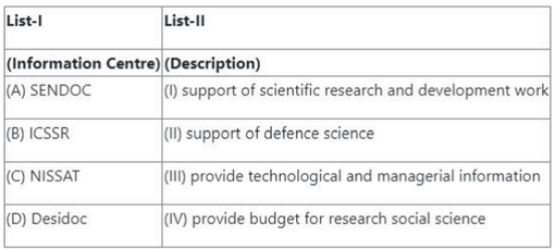 The correct matching is A-III, B-IV, C-I, D-II. Quick Tip: Use the acronyms as clues: \(\textbf{Desidoc}\) has 'defence'. \(\textbf{ICSSR}\) has 'social science'. \(\textbf{NISSAT}\)'s 'S' and 'T' point to Science and Technology. \(\textbf{SENDOC}\)'s 'SE' points to Small Enterprises.