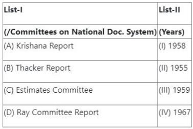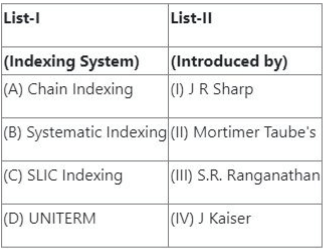 The correct matching is A-III, B-IV, C-I, D-II. Quick Tip: These are classic pairings in library science. Memorize them: \(\textbf{Ranganathan}\) = Chain Indexing. \(\textbf{Taube}\) = Uniterm. \(\textbf{Kaiser}\) = Systematic.