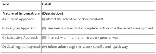 The best logical matching is A-II, B-III, C-I, D-IV. Quick Tip: Associate the approach with the goal: \(\textbf{Current}\) = what's new now. \(\textbf{Exhaustive}\) = everything ever. \(\textbf{Everyday/Catching-up}\) = specific, quick facts.