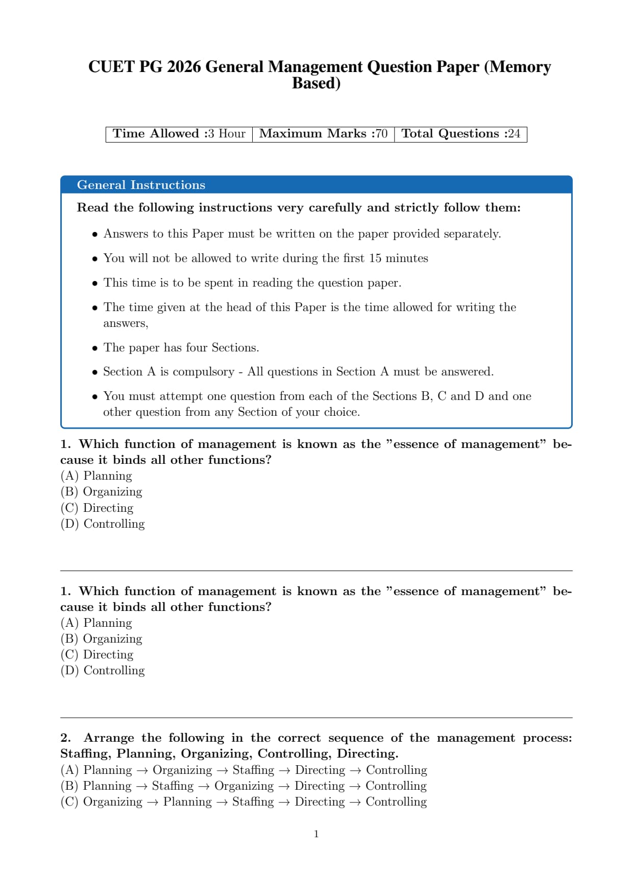 | CUET PG General Management 2026 Question Paper with Answer key | Download PDF | Check Solutions |
