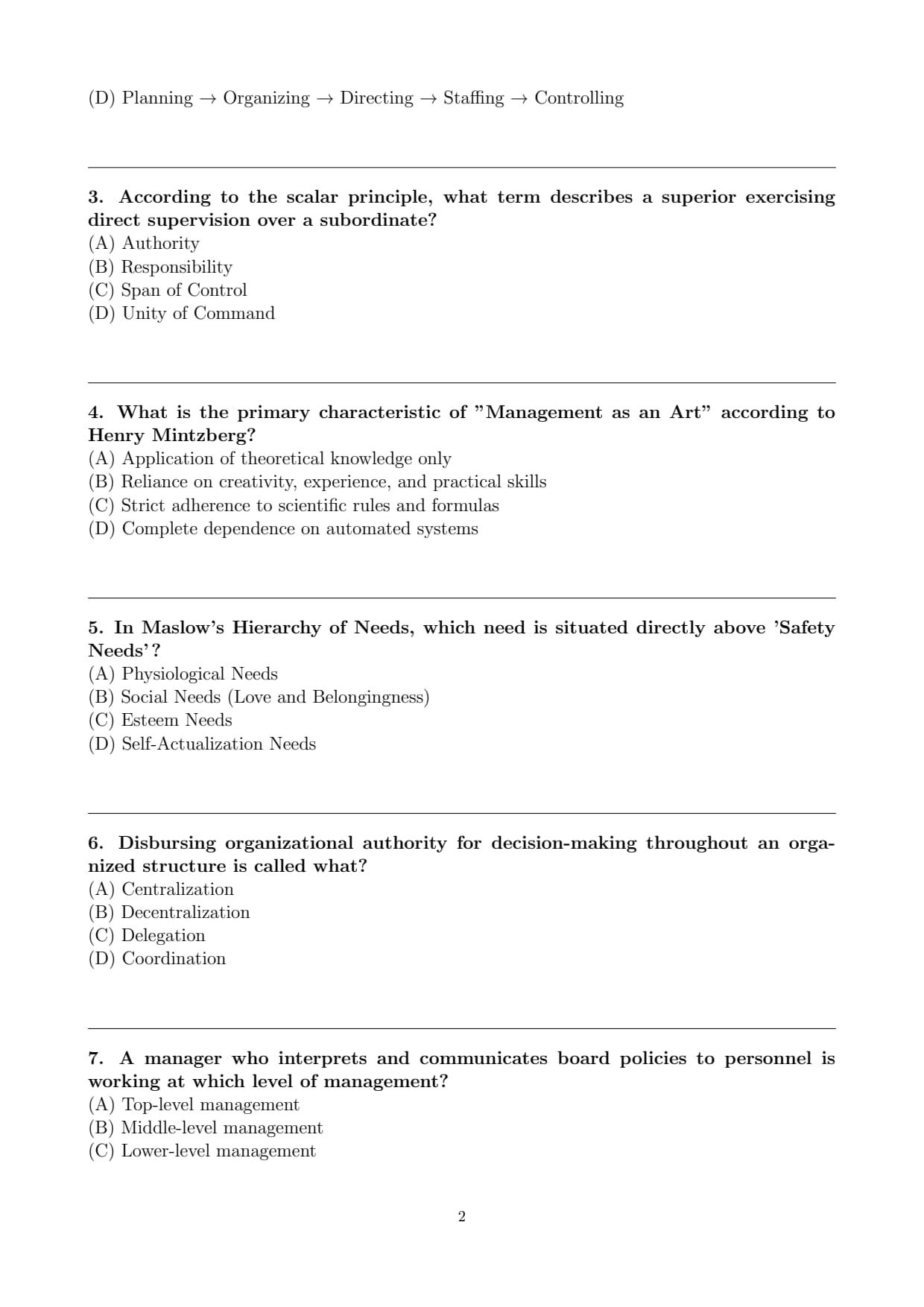 \[ \boxed{Planning → Organizing → Staffing → Directing → Controlling} \] Quick Tip: The standard order of management functions is: \[ \textbf{P → O → S → D → C} \] \textbf{P} – Planning \textbf{O} – Organizing \textbf{S} – Staffing \textbf{D} – Directing \textbf{C} – Controlling Memory trick: \[ \textbf{Plan → Organize → Staff → Direct → Control} \] This sequence reflects the logical flow of managerial activities in any organization.