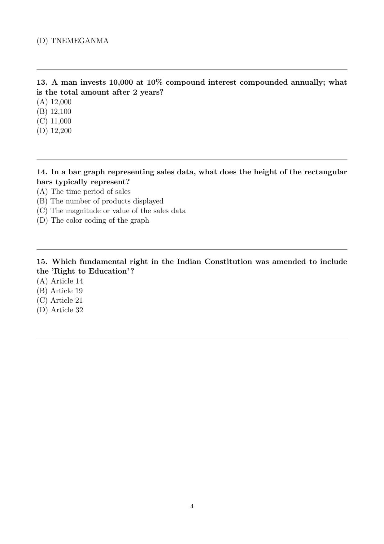 Option (D): TNEMEGANMA — Incorrect arrangement.
