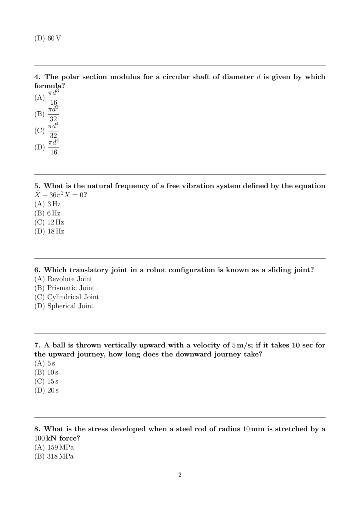 For a solid circular shaft: \[ J = \frac{\pi d^4}{32} \]