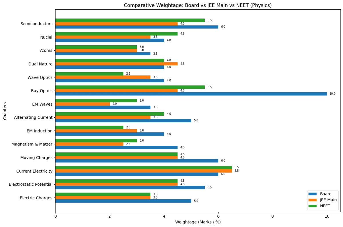 | Divide the time into two. Give 40% to board-style theory + 60% to Long answer and entrance-style speed and problem-solving. Areas with high yields, such as Optics (boards: -14 marks, entrances: 5-10%), Current Electricity (boards: -6 marks, entrances: 6-10%), have the best overlap. |