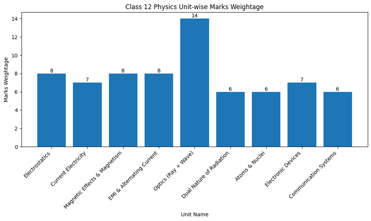 - Electricity and Magnetism units like Electrostatics, Current Electricity, Magnetism, and EMI together cover around 7-8 marks each.
