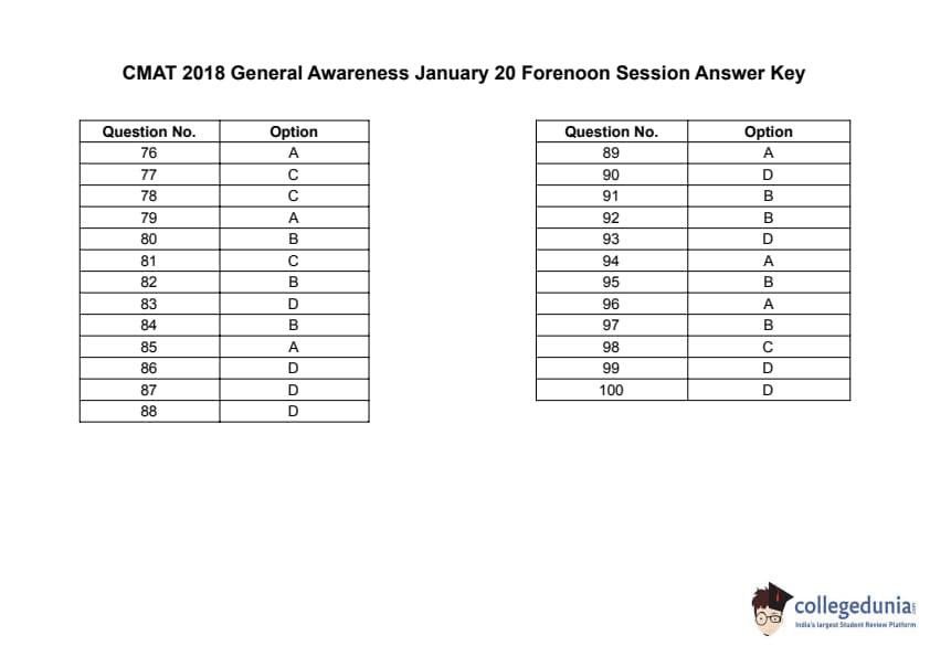CMAT 2018 General Awareness Question Paper with Answer Key PDFs Forenoon Session