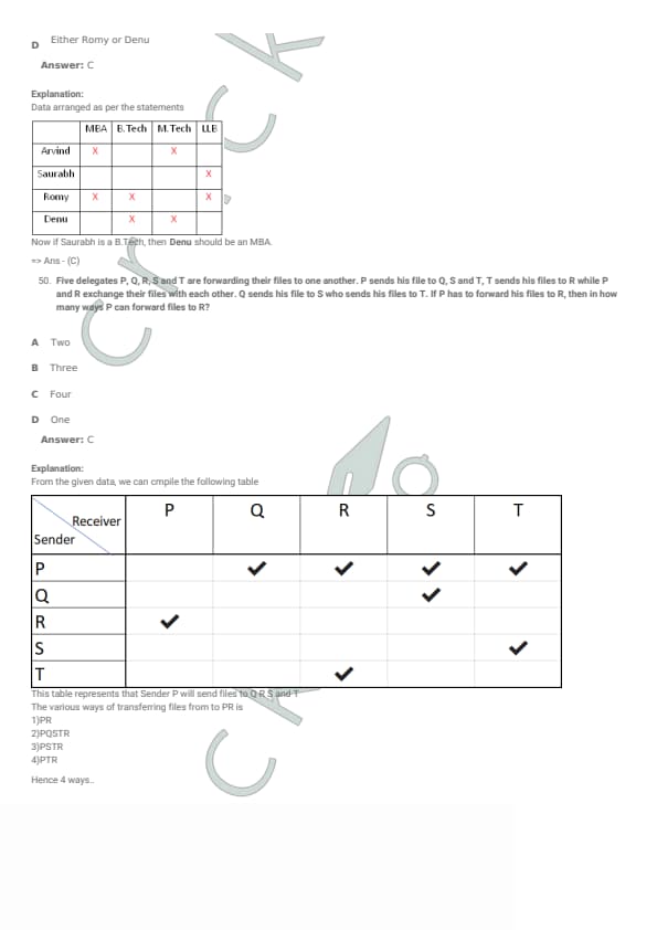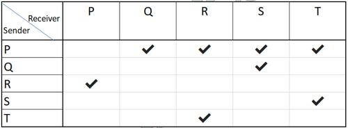 Five delegates P, Q, R, S and T are forwarding their files to one another. P sends his file to Q, S and T, T sends his files to R while P and R exchange their files with each other. Q sends his file to S who sends his files to T. If P has to forward his files to R, then in how many ways P can forward his files to R?