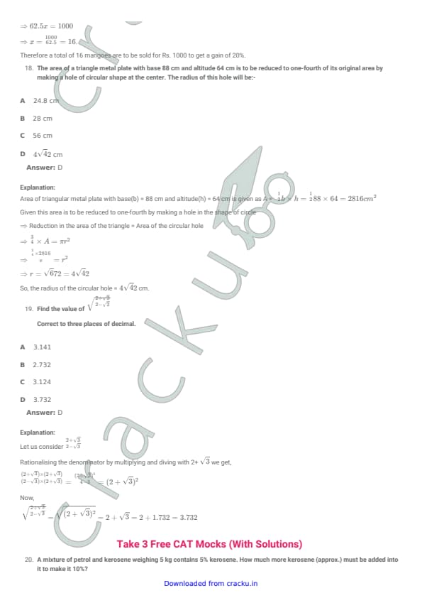 CMAT 2018 Quantitative Techniques and Data Interpretation Question paper with answer key pdf conducted on January 20 in Afternoon Session 2:30 PM to 5:30 PM is available for download. The exam was successfully organized by All India Council for Technical Education (AICTE). The question paper comprised a total of 25 questions. (PDF Source: cracku.in)