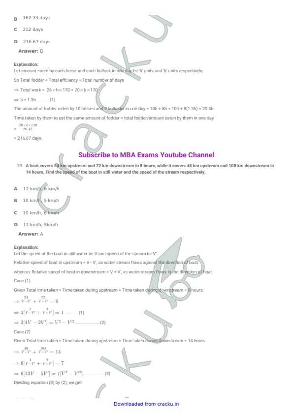 Quick Tip: In boat-stream problems: Upstream \(= V-v\) and Downstream \(= V+v\). Always form equations using time = distance/speed.