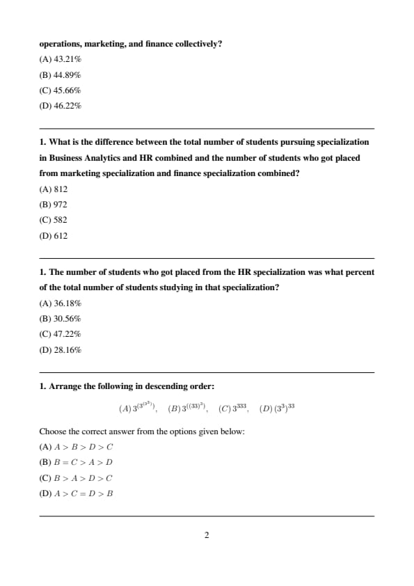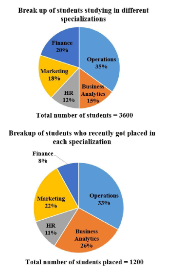 To calculate the percentage, we need the total number of students placed and the total number of students pursuing specializations in operations, marketing, and finance. If these values are provided in the question (e.g., total number placed and total number in each specialization), we can compute the percentage as follows: \[ Percentage = \frac{Total number of students placed}{Total number of students in operations, marketing, and finance} \times 100 \]