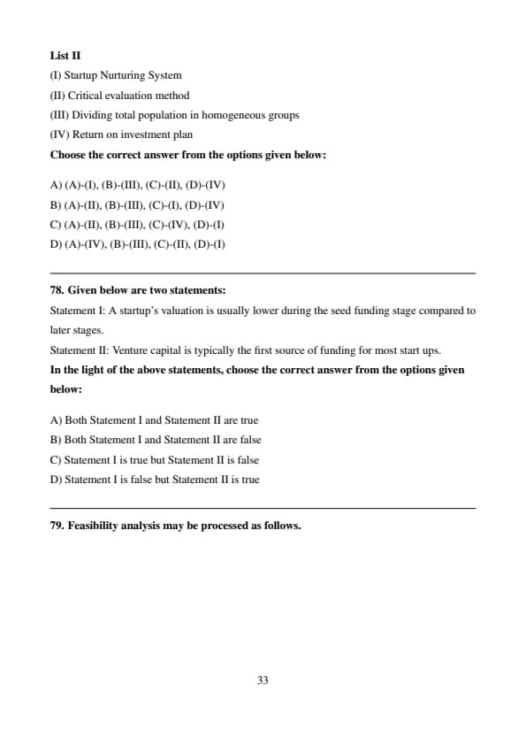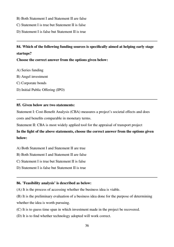 - Statement II is false: The first source of funding for most startups is typically bootstrapping, friends and family, or angel investors—venture capital usually comes in later stages when the startup shows growth potential and scalability. Quick Tip: Seed funding helps startups validate their ideas; venture capital usually steps in once there's proven market traction.
