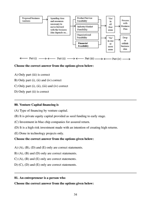 - Part (iv): Based on the analysis, a decision is made—if feasible, proceed; if not, drop the idea. Quick Tip: Feasibility analysis helps avoid costly mistakes by evaluating all critical aspects before launching a business.