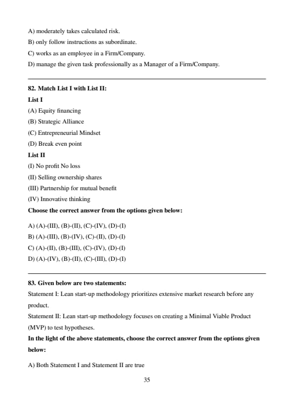 - Statement II is true: The core of lean start-up is building a Minimal Viable Product (MVP) to quickly test assumptions and gather user feedback, allowing iterative improvements. Quick Tip: Lean start-up saves time and resources by validating ideas early through MVPs and real-world feedback.