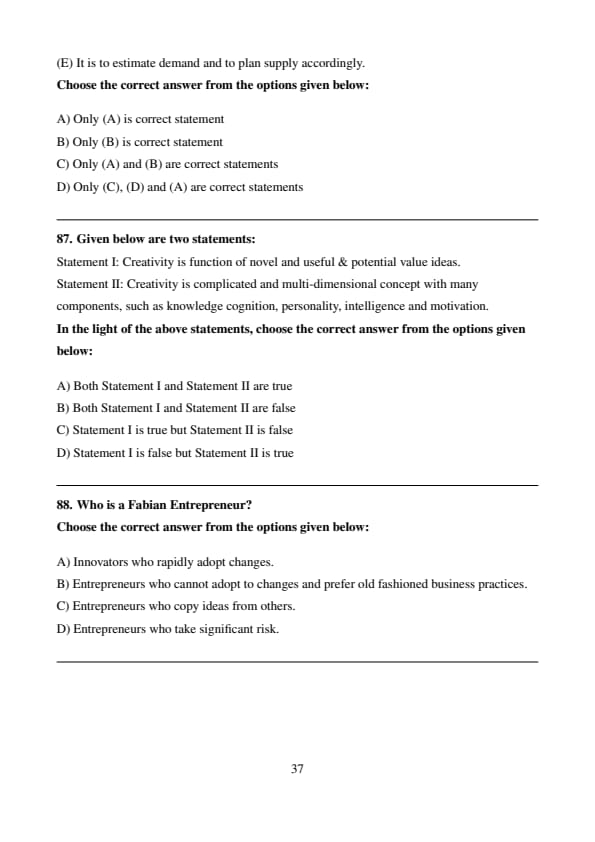 - The other options describe roles that are typically part of structured organizations, not entrepreneurial behavior. Quick Tip: Entrepreneurs balance innovation and risk—they don’t gamble, they strategize.