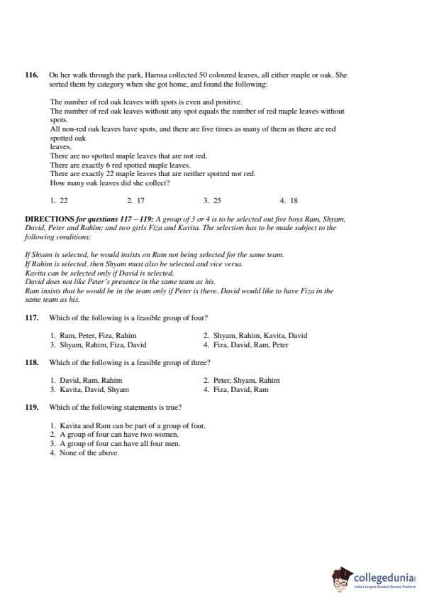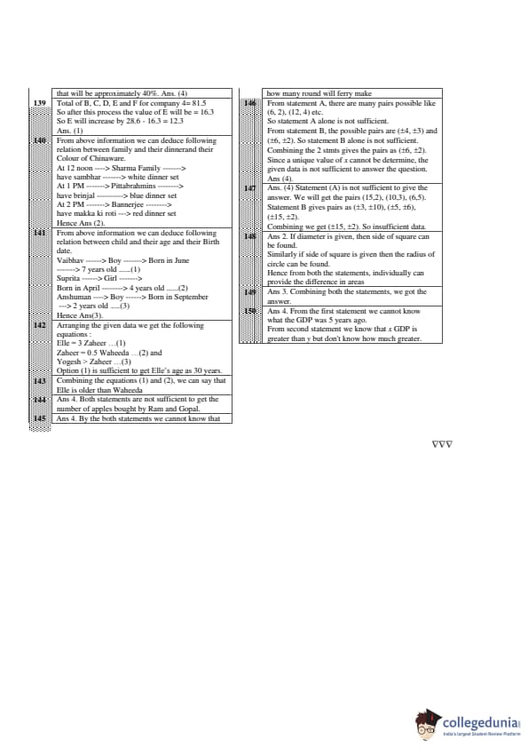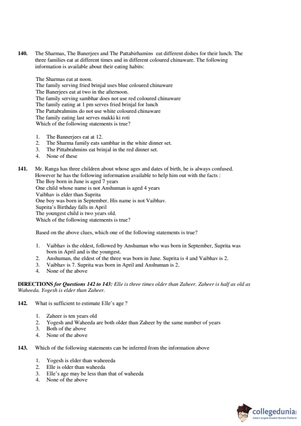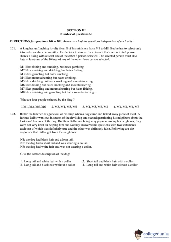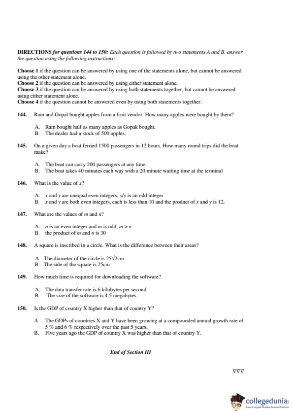The third section of CAT 2001 question paper was based on Data Interpretation and Logical Reasoning (DILR). This section also carried 50 questions. 23 questions distributed between six sets were based on DI, 7 questions were based on data sufficiency, and 20 questions were based on logical reasoning. The DI section was rated easy. The 7 questions based on DS were the easiest questions in CAT 2001 paper.