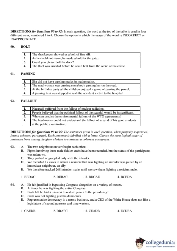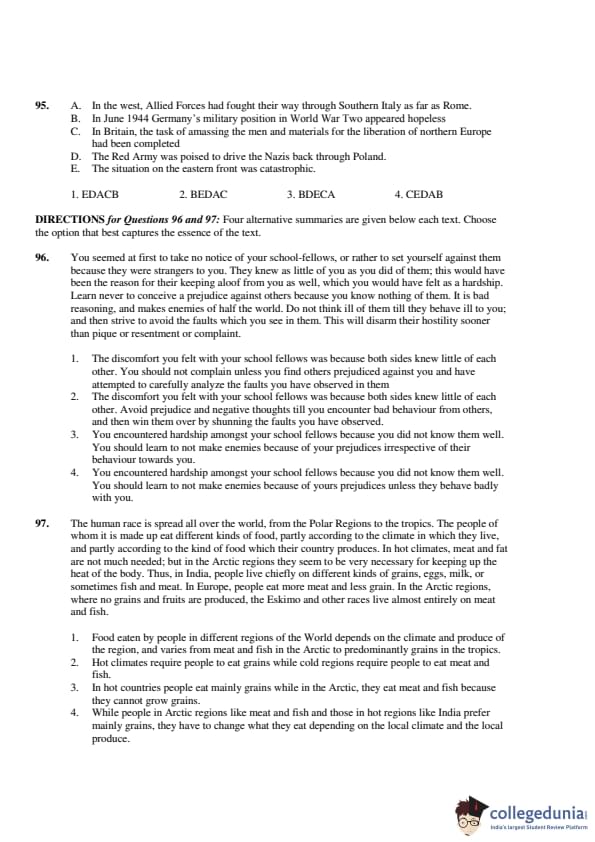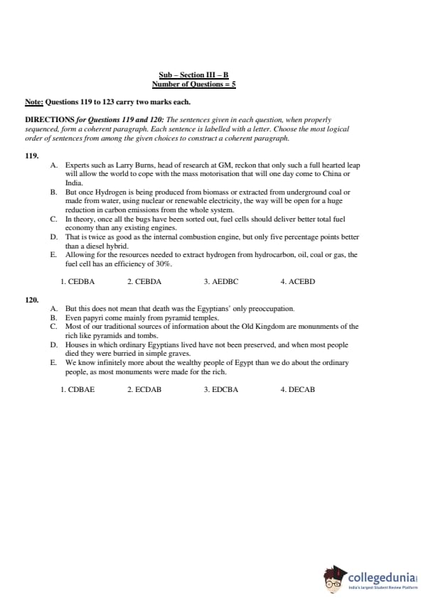 Thus, the correct order is: \[ \boxed{(3) \ CEBDA} \] Quick Tip: Look for the key statement or argument in the opening sentence and ensure subsequent sentences provide supporting information in a logical flow.