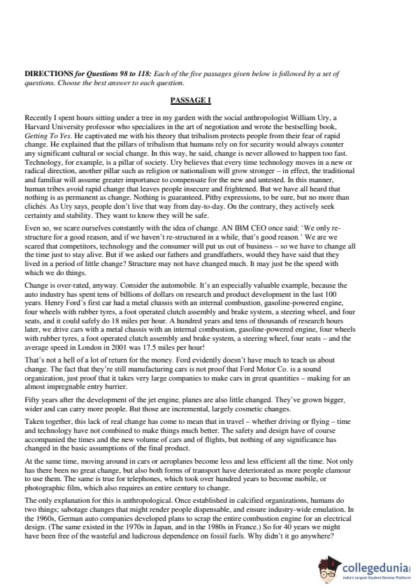 The passage emphasizes the little progress made in terms of speed, despite large investments and technological advancements. It specifically mentions that the average speed of cars in London in 2001 was 17.5 miles per hour, nearly the same as Ford's first car. Therefore, the Correct Answer is: \[ \boxed{(2) \ The speed at which an automobile is driven in a city has not changed much in a century.} \] Quick Tip: Look for details in the passage that highlight stagnation or minimal change over time in a specific industry.