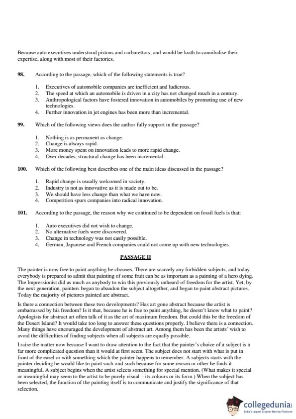 The passage explains that auto executives resisted changing from the traditional combustion engine to electric designs, as they were too attached to their existing expertise and factories. This reluctance to change is why the auto industry continued to depend on fossil fuels. Therefore, the Correct Answer is: \[ \boxed{(1) \ Auto executives did not wish to change.} \] Quick Tip: Look for the passage's critiques of industry leaders' reluctance to innovate and how their decisions impacted the adoption of new technologies.