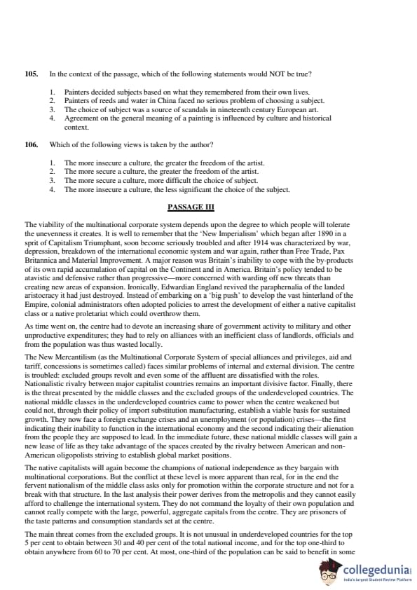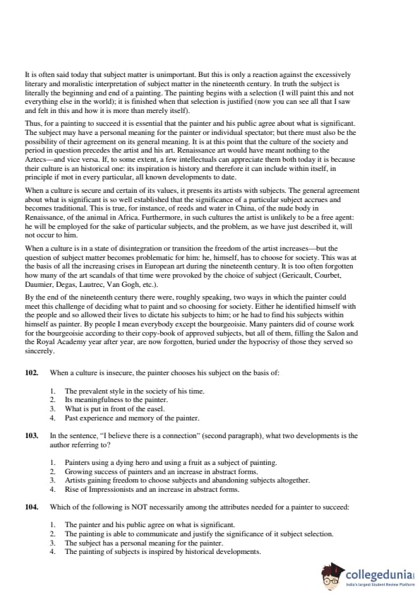 The passage suggests that in stable cultural contexts, like in China, artists had established subjects to choose from, such as reeds and water. However, in other contexts, like 19th-century Europe, artists faced significant challenges with subject choice, leading to scandals. Thus, the Correct Answer is: \[ \boxed{(2) \ Painters of reeds and water in China faced no serious problem of choosing a subject.} \] Quick Tip: Note the contrast between cultures with fixed artistic traditions and those undergoing transitions, where subject choice becomes more complex.