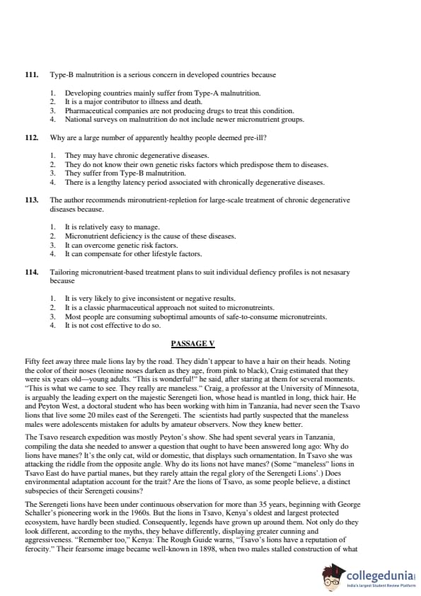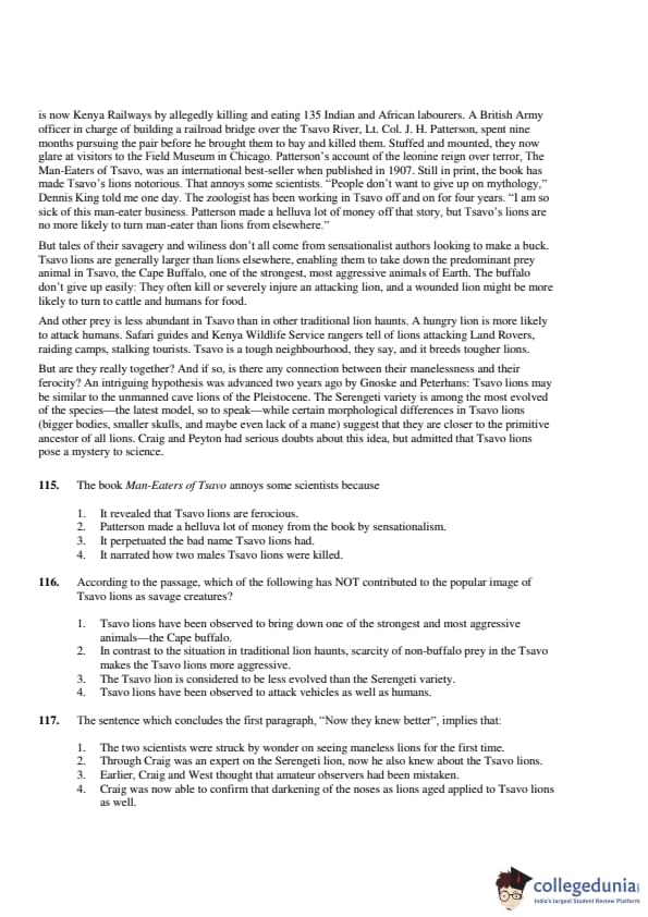 The passage states that the Tsavo lions are generally perceived as more aggressive due to the environment and prey scarcity, but it does not specifically attribute their savagery to being less evolved than Serengeti lions. Therefore, the Correct Answer is: \[ \boxed{(3) \ The Tsavo lion is considered to be less evolved than the Serengeti variety.} \] Quick Tip: Be aware of how the passage distinguishes between environmental factors and biological explanations for behaviors.