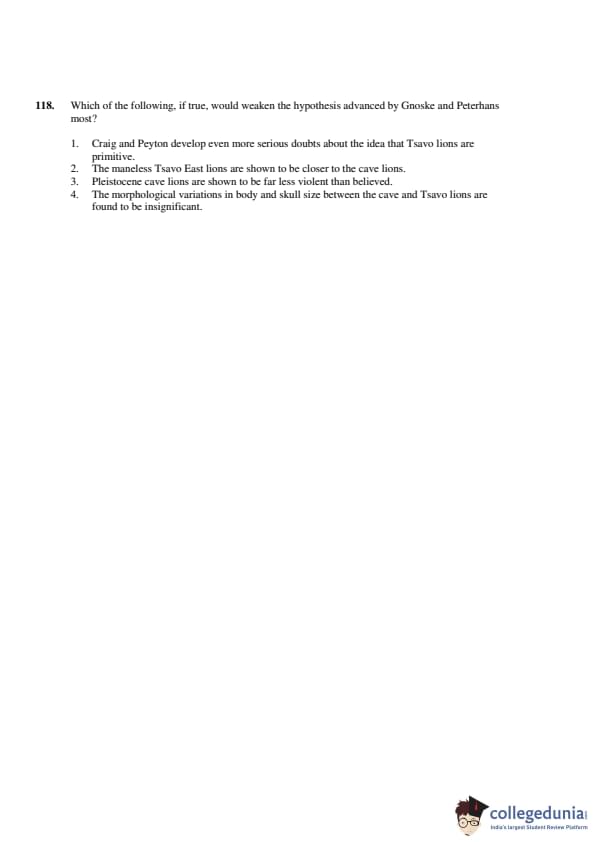 The hypothesis advanced by Gnosek and Peternahns suggests that Tsavo lions are similar to cave lions, but if the morphological differences between them were found to be insignificant, it would weaken their argument. Therefore, the Correct Answer is: \[ \boxed{(4) \ The morphological variations in body and skull size between the cave and Tsavo lions are found to be insignificant.} \] Quick Tip: Focus on details that directly challenge the core of a scientific hypothesis, such as anatomical or behavioral similarities.