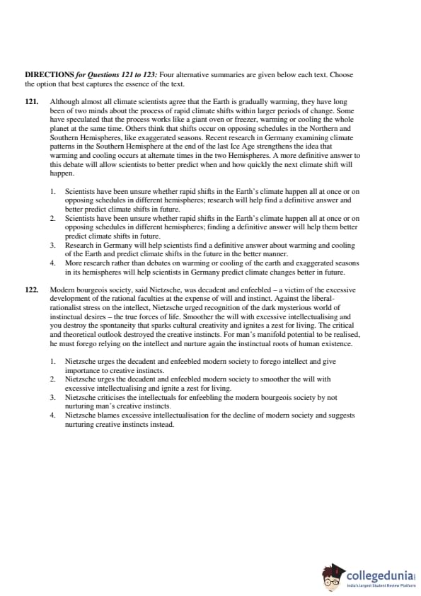 The passage outlines Nietzsche’s criticism of the overemphasis on intellect, which he believes stifles creativity and spontaneity. He advocates for a return to creative instincts. Therefore, the Correct Answer is: \[ \boxed{(4) \ Nietzsche blames excessive intellectualization for the decline of modern society and suggests nurturing creative instincts instead.} \] Quick Tip: Look for answers that highlight Nietzsche’s critique of intellectualism and his focus on instinctual creativity.