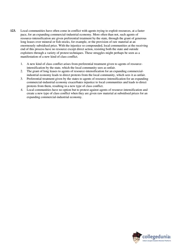 The passage emphasizes that local communities, affected by preferential treatment granted to agents of resource-intensification by the state, protest due to the injustice they perceive. This conflict is a result of the compounded inequality, creating a new form of class conflict. Therefore, the Correct Answer is: \[ \boxed{(3) \ Preferential treatment given by the state to agents of resource-intensification for an expanding commercial-industrial economy exacerbates injustice to local communities and leads to direct protests from them, resulting in a new type of class conflict.} \] Quick Tip: Look for summaries that address the core issue of the conflict and its causes, especially those that highlight the role of the state and resource exploitation.