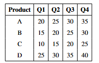The table below shows the sales (in Rs. lakh) of four products A, B, C, and D across four quarters of 2015. What is the total sales of product A across all quarters?