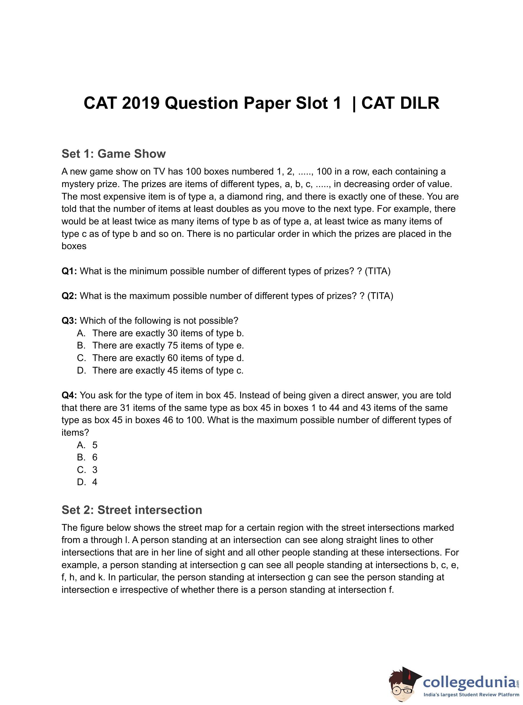 Candidates preparing for CAT 2025 can download the CAT DILR question paper with the solution PDF for the Slot 1 exam conducted on November 24, 2019, to get a better idea about the type of questions asked in the paper and the difficulty level of questions.