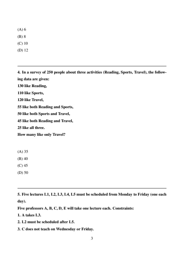 In a survey of 250 people about three activities (Reading, Sports, Travel), the following data are given: