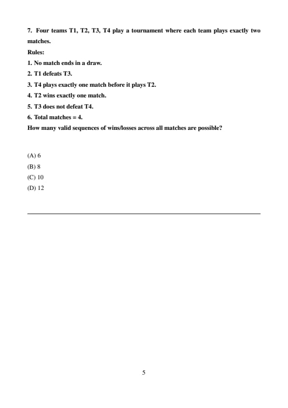 Four teams T1, T2, T3, T4 play a tournament where each team plays exactly two matches.