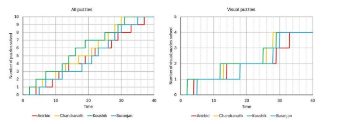 Anirbid, Chandranath, Koushik, and Suranjan participated in a puzzle-solving competition. The competition comprised 10 puzzles that had to be solved in the same sequence, i.e., a competitor got access to a puzzle as soon as they solved the previous puzzle. Some of the puzzles were visual puzzles, and others were number-based puzzles. The winner of the competition was the one who solved all puzzles in the least time.