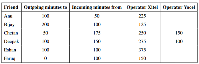 Anu, Bijay, Chetan, Deepak, Eshan, and Faruq are six friends. Each of them uses a mobile number from exactly one of the two mobile operators - Xitel and Yocel. During the last month, the six friends made several calls to each other. Each call was made by one of these six friends to another. The table below summarizes the number of minutes of calls that each of the six made to (outgoing minutes to) and received from (incoming minutes from) these friends, grouped by the operators. Some of the entries are missing.