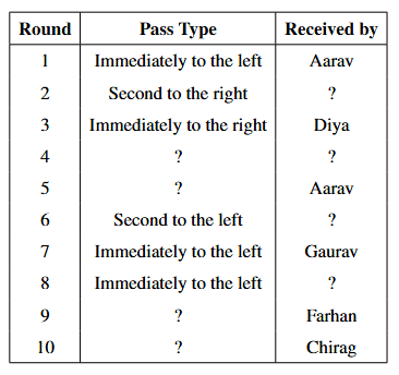 The game is played over 10 rounds. In each round, the child holding the Buck must pass it directly to a child sitting in one of the following positions: