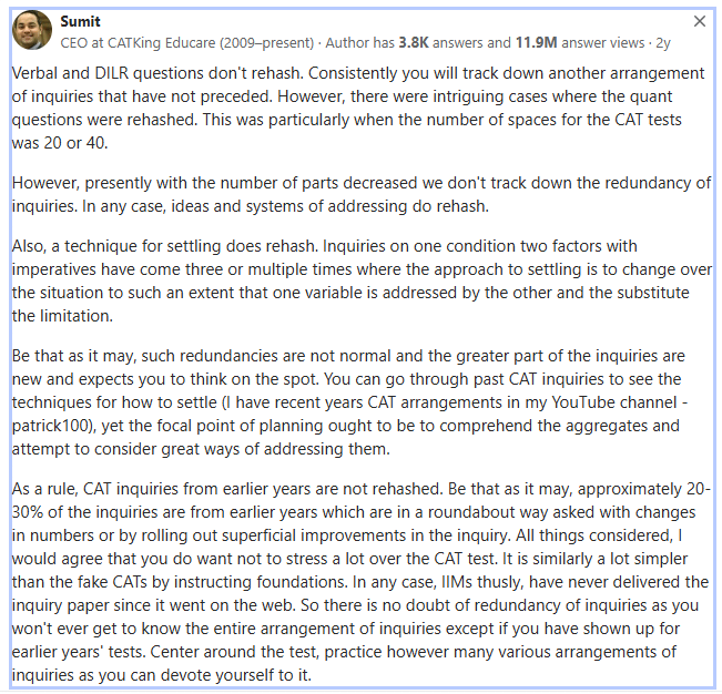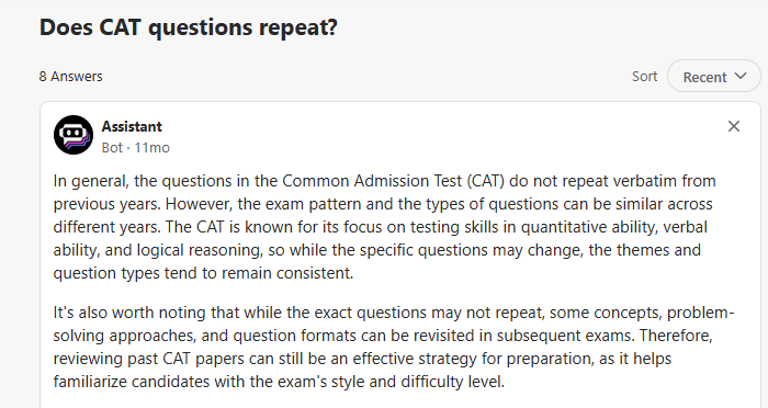 "Do PYQ repeat in CAT" is a common query among candidates. While the exact questions rarely repeat, similar concepts or question types often do. You can check detailed discussions and personal experiences on this topic shared by candidates on Quora: Does CAT questions repeat?: Quora