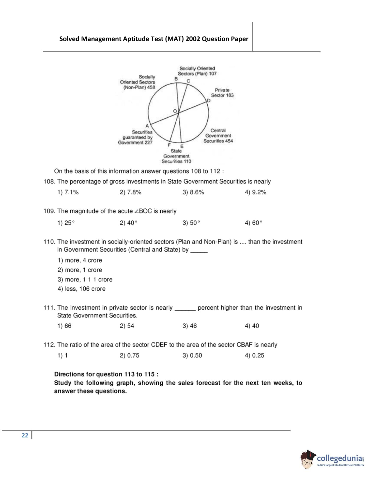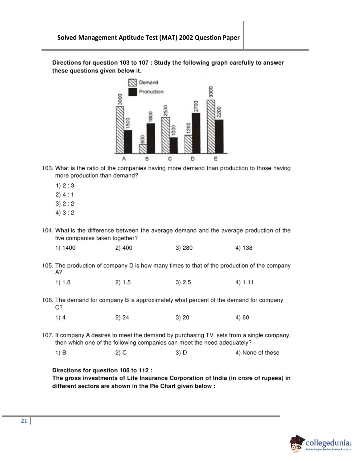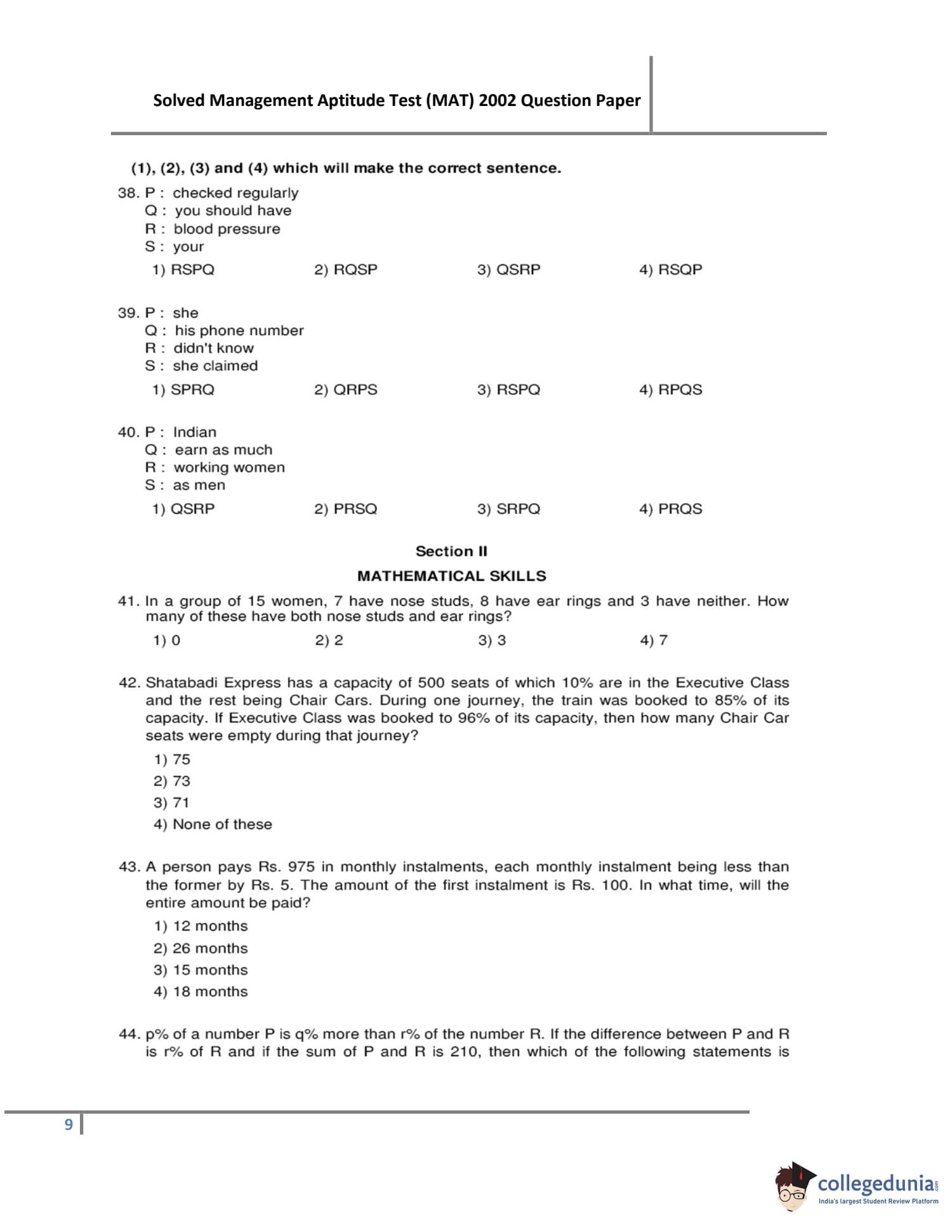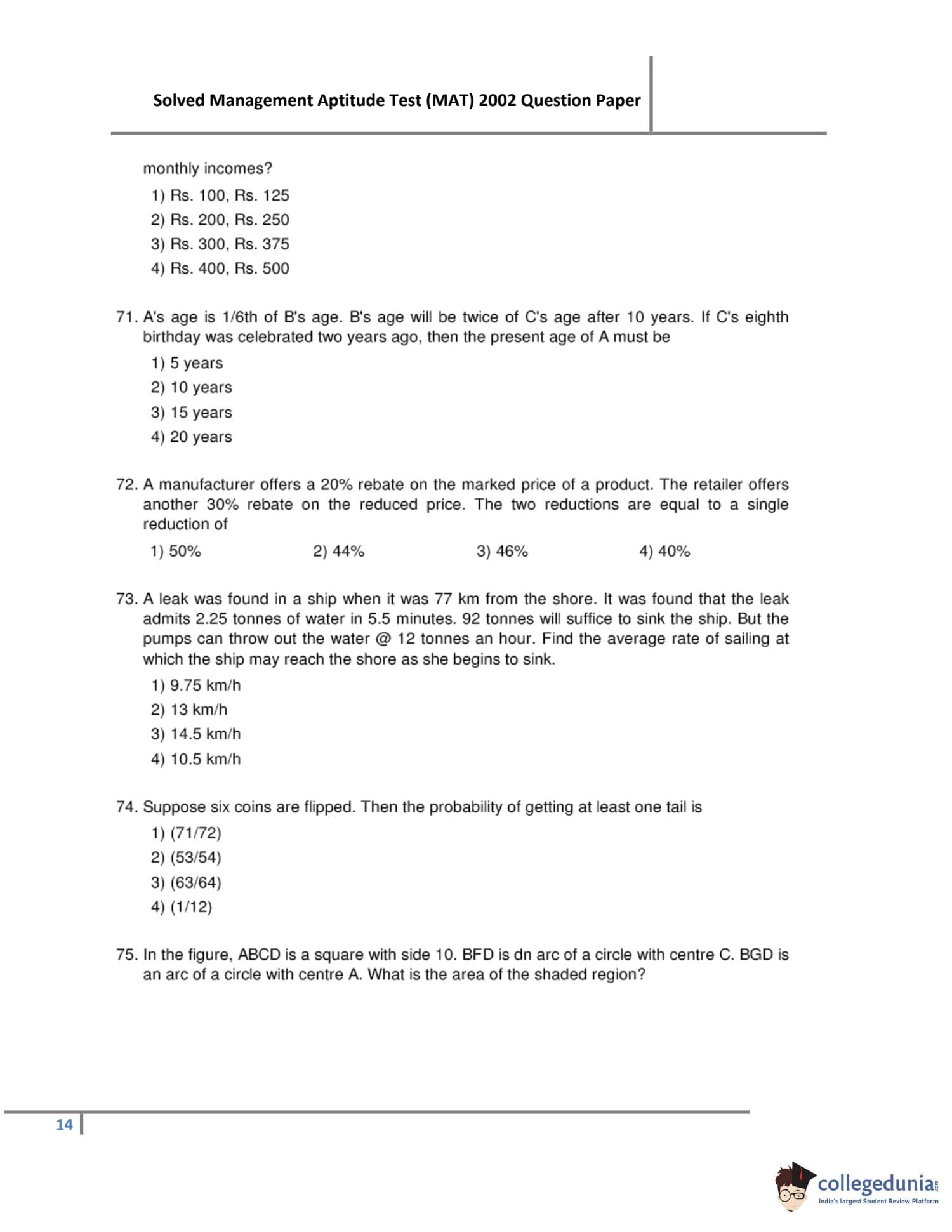 MAT 2002 Question Paper had 200 MCQs from five sections- Language Comprehension, Data Analysis and Sufficiency, Mathematical Skills, Intelligence and Critical Reasoning, Indian and Global Environment. Each section of MAT 2002 Question Paper had 40 questions. The overall difficulty level of MAT Question Paper 2002 was rated moderate. Candidates preparing for upcoming MAT exam can download and solve MAT 2002 Question Paper with Solutions PDF given below: