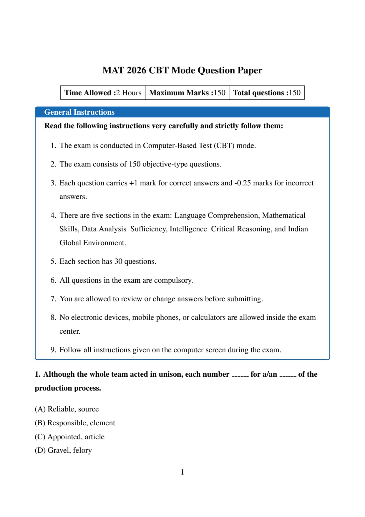 MAT 2026 CBT Question Paper consists of 150 multiple-choice questions (MCQs) divided into five sections: Language Comprehension, Intelligence and Critical Reasoning, Mathematical Skills, Data Analytics, and Indian & Global Environment with 30 questions each. The pattern and structure remains consistent with the previous year's exams. Scoring is +1 for correct answers and -0.25 for incorrect ones.
