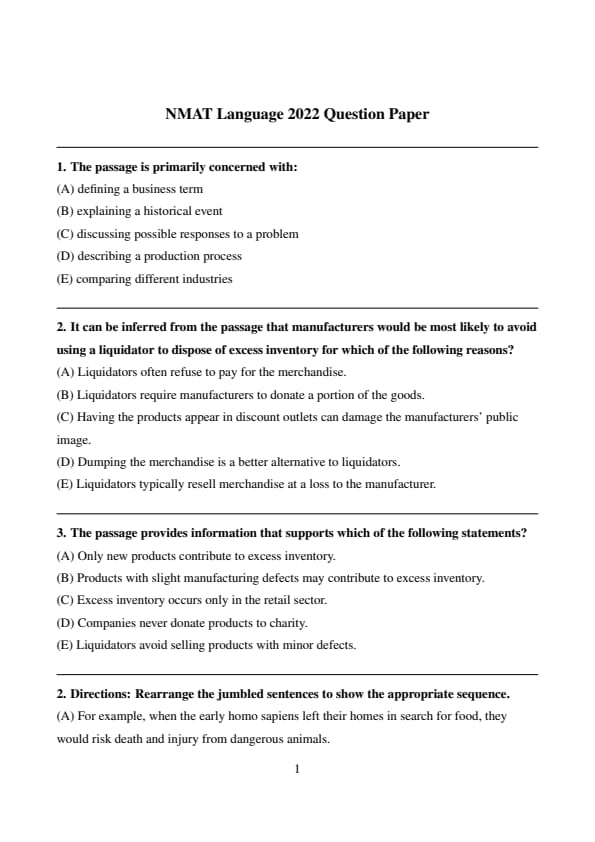 The NMAT 2022 Language Skills Question Paper, along with its detailed solutions, is now available for download in PDF format. This valuable resource is designed to assist candidates preparing for the NMAT (National Management Admission Test), an important entrance exam for admission to various MBA programs in India and abroad. The Language Skills section of the NMAT evaluates candidates' proficiency in understanding and using the English language effectively, with a focus on reading comprehension, vocabulary, grammar, and sentence correction.