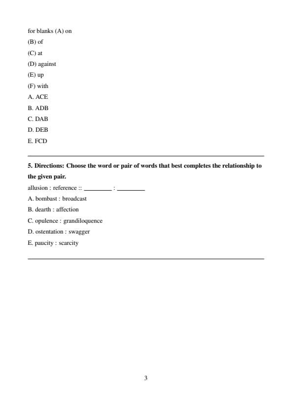 Directions: Choose the set of prepositions whose meaning and sequence best fits the 3 given sentences.
