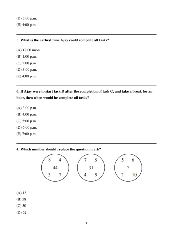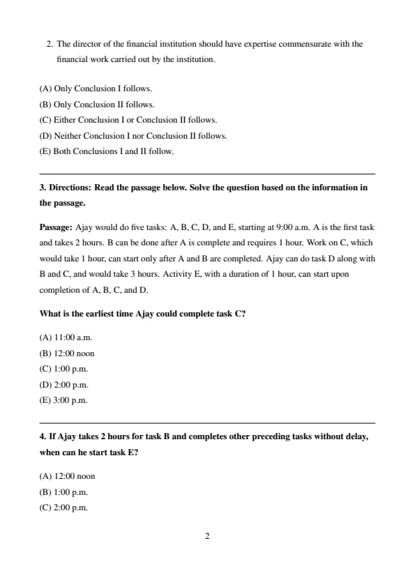 Thus, the earliest time Ajay could complete all tasks is 3:00 p.m. Quick Tip: To determine when all tasks are completed, track the dependencies between tasks and ensure each one starts as soon as possible. In this case, task E depends on the completion of A, B, C, and D.